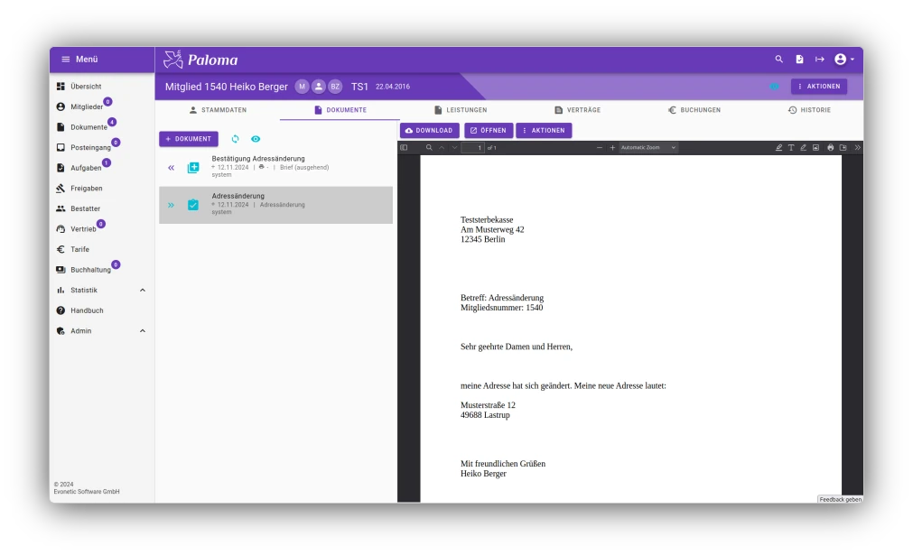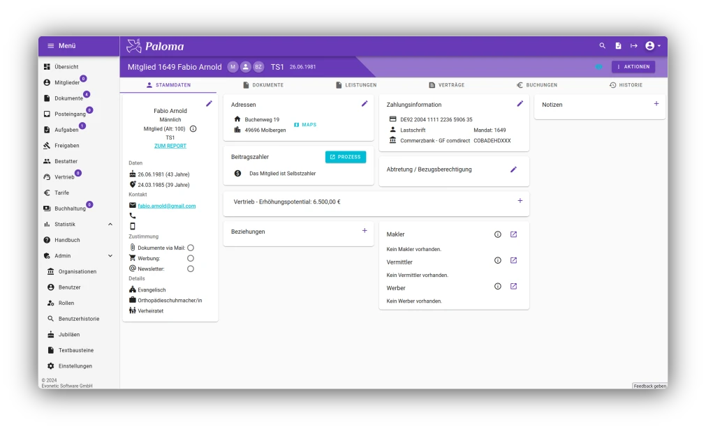 Mit Paloma vereinfachen Sie komplexe Verwaltungsaufgaben und steigern die Effizienz Ihres Vereins. Unsere Software bietet eine intuitive Benutzeroberfläche und umfassende Funktionen, die speziell für die Bedürfnisse von Sterbegeldversicherungen entwickelt wurden.